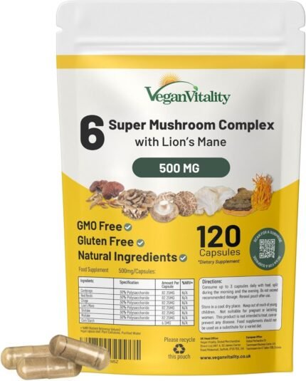 Mushroom Complex 6 Lions Mane Mushroom Supplement 120 Capsules High Strength Vegan Supplement with Lions Mane, Reishi, Chaga Mushroom Powder, Shitake, Cordyceps & Maitake (120 Capsules)