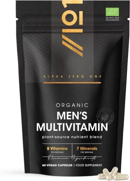 Organic Men’s Multivitamins and Minerals – 100% Plant Based – 15 Organic Vitamins & Minerals – 60 Vegan Capsules – Resealable and Recyclable Pouch by Alpha01