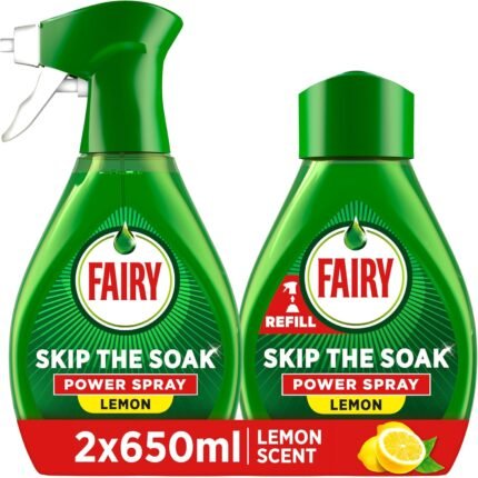 Fairy Skip the Soak Dish Spray Kit, Lemon, 1.3L (650ml Spray + 650ml Refill), 100% Grease Removal for Dishes & Surfaces