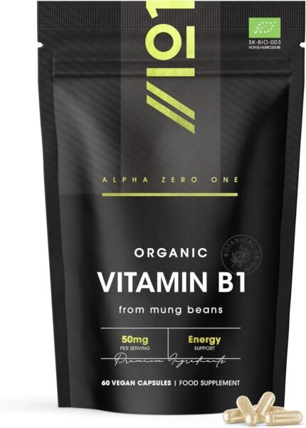 Organic Vitamin B1 Thiamin 50mg – 100% Plant Based (Mung Beans) – 60 Vegan Capsules – Contributes to Normal Functioning of The Nervous System – Resealable and Recyclable Pouch by Alpha01
