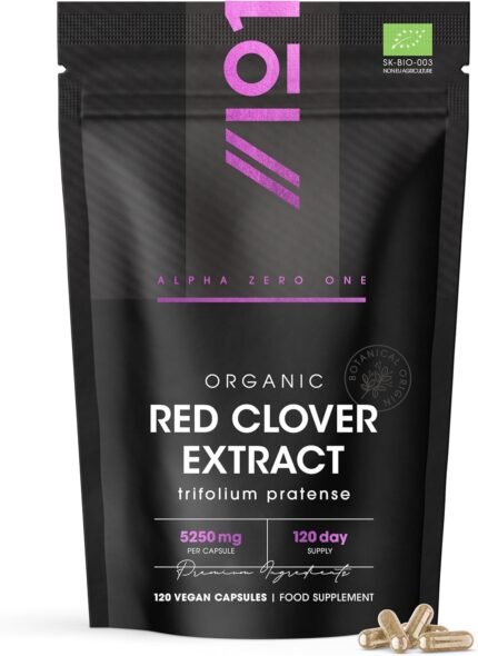 Organic Red Clover Extract 5250mg – for Use During The Menopause – 120 Vegan Capsules – Resealable and Recyclable Pouch by Alpha01