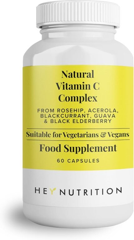 Hey Nutrition Natural Vitamin C 250mg Complex from Rosehip, Acerola, Blackcurrant, Guava, and Elderberry – Immune Function, Stress, Metabolic Health, & Fatigue – Non-GMO, 60 Vegan Capsules