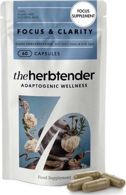 Focus & Clarity – Lion’s Mane Focus Supplement with Holy Basil, Rosemary & Adaptogens for Memory, Concentration & Cognitive Support, Vegan, Organic Capsules, 60 Capsule Pouch