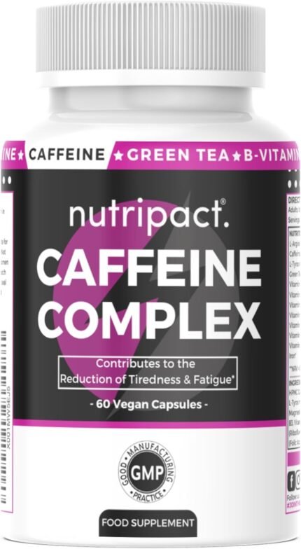 Nutripact Caffeine Capsules 12-in-1 Energy Booster Complex with Green Tea, L-Tyrosine, L-Arginine, B Vitamins, VIT C & Iron – for Running, Pre Workout, Focus, Tiredness & Fatigue – 60 Vegan Capsules