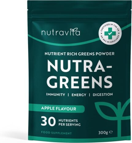 Nutravita Super Greens Powder – 23 Advanced Vegan Ingredients – Greens, Vitamins and Superfoods – Probiotic Blend for Gut Health – UK Made – 30 Servings (Apple Flavour)