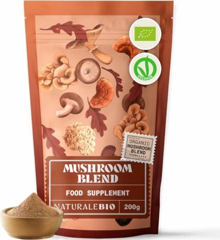 NaturaleBio Organic Mushroom Powder 200g. 7in1 Mushroom Blend with Reishi, Lions Mane, Chaga, Maitake, Cordyceps, Shiitake & Tremella. Non-GMO. Boosts Energy & Supports Cognitive Function
