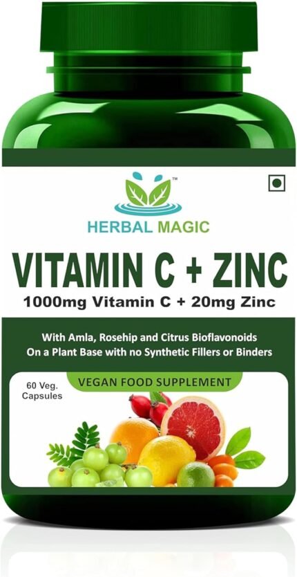 Herbal Magic Vitamin C + Zinc Supplement – Immune Support, Antioxidant Protection, and Skin Health – (60 Capsules)