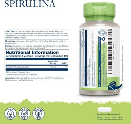 Solaray – Spirulina Algae – 100 Vegan Capsules not Tablets or Powder – Rich in Protein, Vitamin & Minerals -High Strength Supplement – Lab Verified, GMO & Magnesium Stearate Free