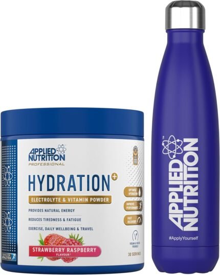Applied Nutrition Hydration Electrolyte & Vitamin Powder + Blue Steel Flask 500ml- Natural Energy & Reduces Tiredness & Optimise Hydration (240g – 30 Servings)(Strawberry & Raspberry)