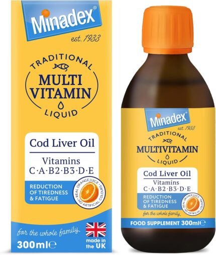 Multivitamin Liquid with Cod Liver Oil for Adults & Kids, Delicious Orange Flavour, Vitamins C, A, B2, B3, D, E & Omega-3, Boost Energy & Reduces Tiredness, Supports Immunity, 300ml