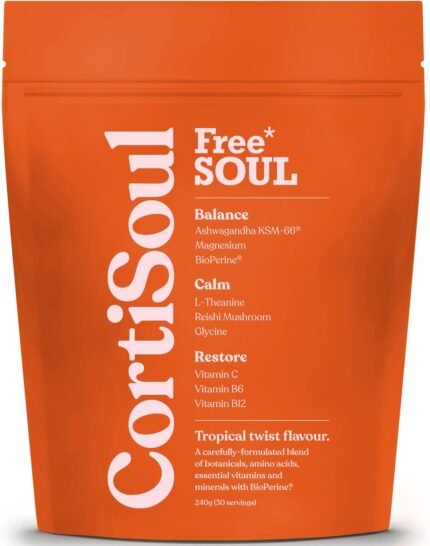 Free Soul CortiSoul with KSM-66® Ashwagandha, L-theanine, Magnesium & Reishi Mushrooms | Nutrient-Rich Superfoods, Adaptogens & Vitamins | Vegan | 30 Servings | Tropical Twist Flavour