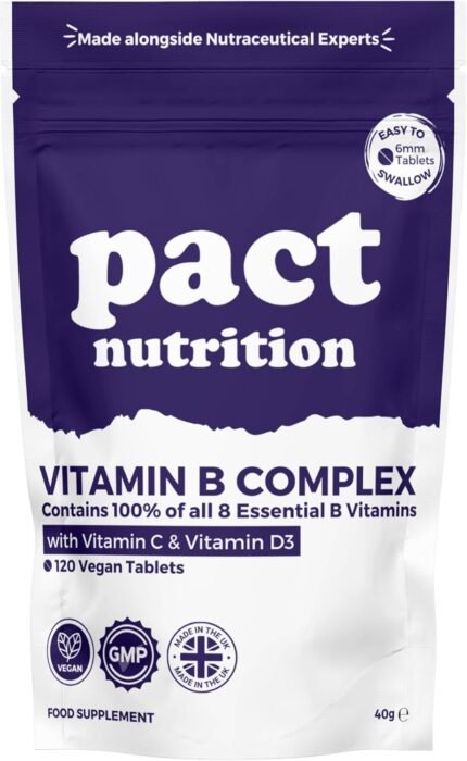 Vitamin B Complex High Strength – All 8 B Vitamins (B1, B2, B3, B5, B6, B7, B9, B12) + Biotin & Folic Acid – with Vitamin C & D3 – 120 Vegan Tablets – Energy & Immunity Support – Pact Nutrition