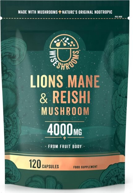 Lions Mane Supplement 4000mg with Reishi Mushroom | Lions Mane Capsules High Strength | 120 Powder Capsules | Vegan | Wiseshrooms
