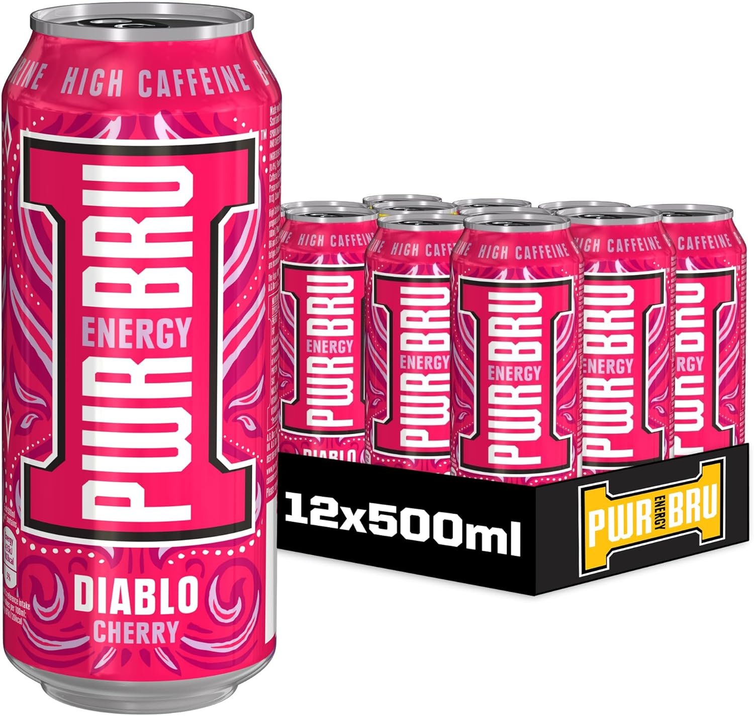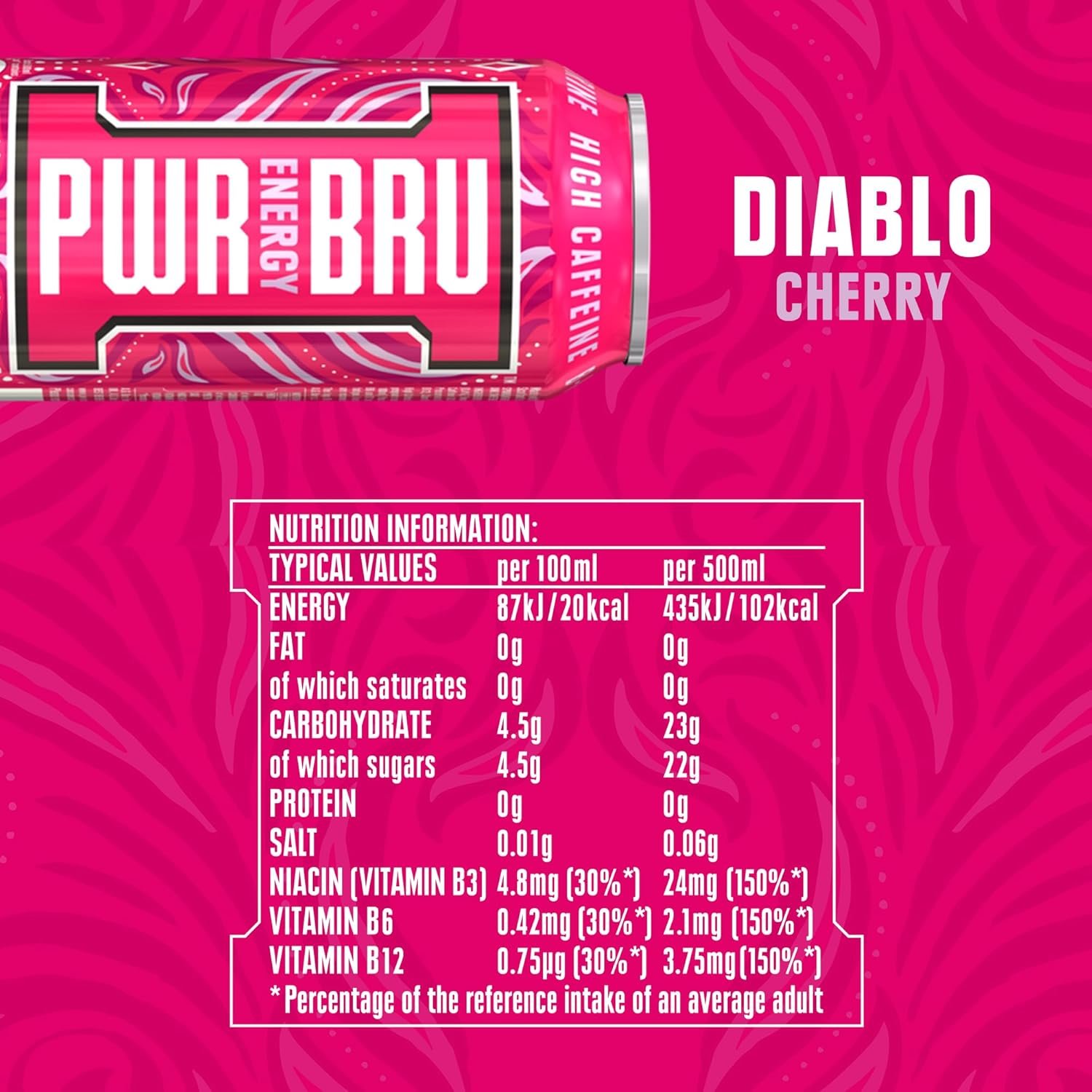 𝐏𝐖𝐑-𝐁𝐑𝐔 Diablo Cherry 12 Pack Big Can Energy Drink with High Caffeine, Taurine and Vitamins – 12 x 500ml Cans