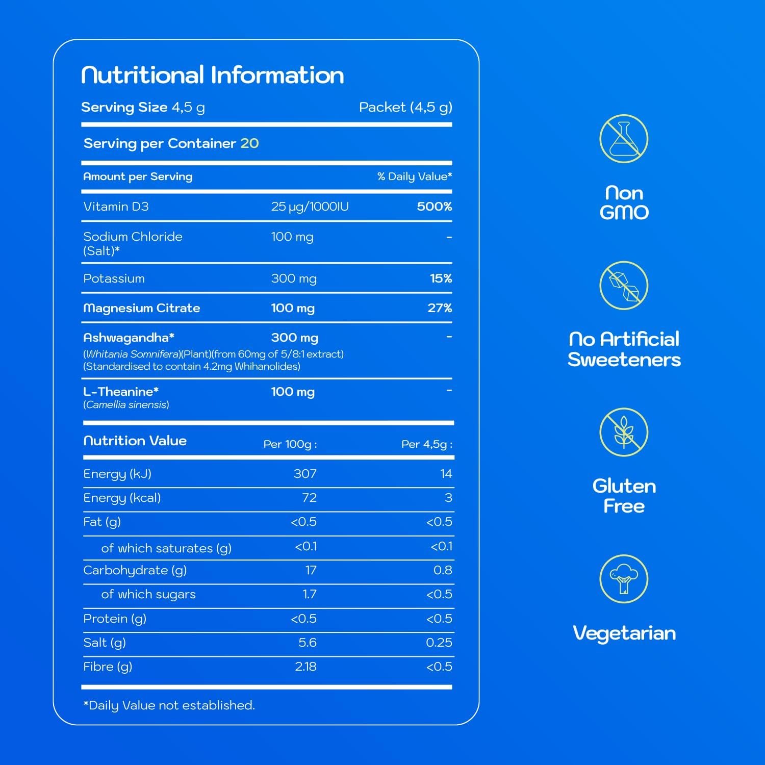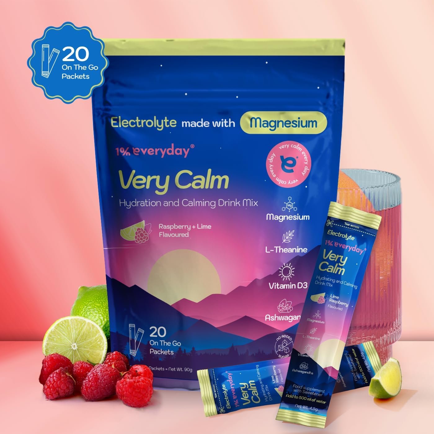 1% Everyday Cortisol Drink Sachets – Magnesium Powder with Ashwagandha, L-Theanine, Vitamin D3, Sodium & Potassium – Sugar Free Calm Drink for Stress Relief, Focus, Memory & Relaxation – 20 Servings