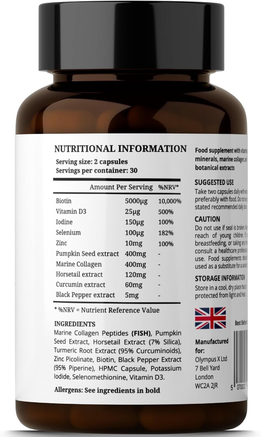 Comprehensive 10-In-1 Formula – Combines 10 active nutrients including Pumpkin Seed Extract, Marine Collagen Peptides, Horsetail Extract, Curcumin Extract, Zinc, Biotin, Black Pepper Extract, Iodine, Selenium and Vitamin D3 to support all of the hair’s nutritional needs from within.