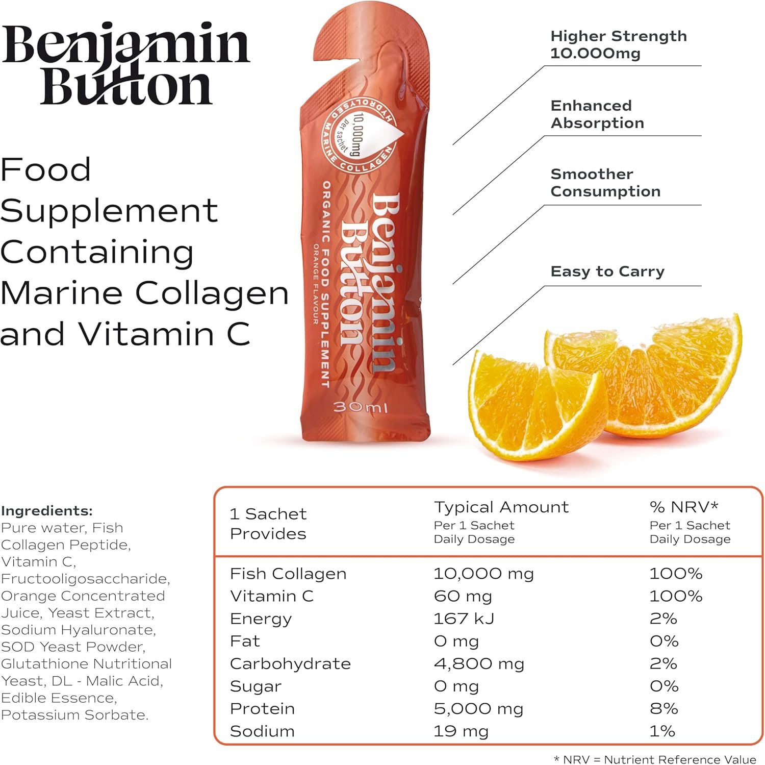 14x Marine Collagen Liquid Sachets – 10,000mg Hydrolysed Type 1 with Vitamin C | Skin, Hair, Nails | Orange Flavor | 2-Week Supply | Higher Absorption vs. Powder/Tablets – Benjamin Button®