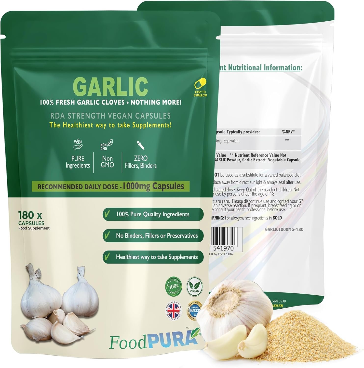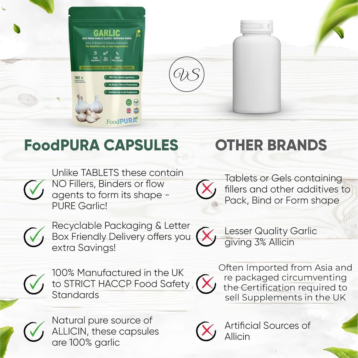 ✅ High Strength, Easy to Swallow, Vegetarian & Vegan Friendly Garlic Capsules : Each Capsule Contains the Optimum Daily Recommended Dose of 1000mg of Pure Garlic, the Equivalent to a Whole Clove of Garlic, making our FoodPURA Capsules a very convenient way of getting your daily dose of Garlic and making the most of Garlic’s many benefits which include maintaining a healthy heart, blood circulation and immune system! Our garlic capsules are specially formulated to retain the active compound allicin, which is responsible for many of garlic’s health benefits.