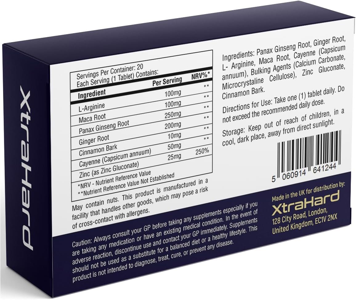 Premium Quality Ginseng Supplement. 100% Natural Ingredients. Discreet Shipping. 100% Customer Satisfaction. Package: 1 Supplement pack with 10 tablets. Manufactured in the UK. Ingredients: Panax Ginseng Root 250mg (*NRV% **), Ginger Root 200mg (*NRV% **), L- Arginine 100mg (*NRV% **), Maca Root 100mg (*NRV% **), Cayenne (Capsicum annuum) 50mg (*NRV% **), Bulking Agents (Calcium Carbonate, Microcrystaline Cellulose), Zinc Gluconate 25mg (*NRV% 250%), Cinnamon Bark 10mg (*NRV% **), *NRV – Nutrient Reference Value, **Nutrient Reference Value Not Established. Warning: May contain nuts. This product is manufactured in a facility that handles other goods, which may pose a risk of cross-contact with allergens. Some individuals may be sensitive to higher doses of Zinc or Cayenne (Capsicum annuum), which can occasionally cause stomach upset. Discontinue use if any adverse reaction occurs and consult your GP if needed.