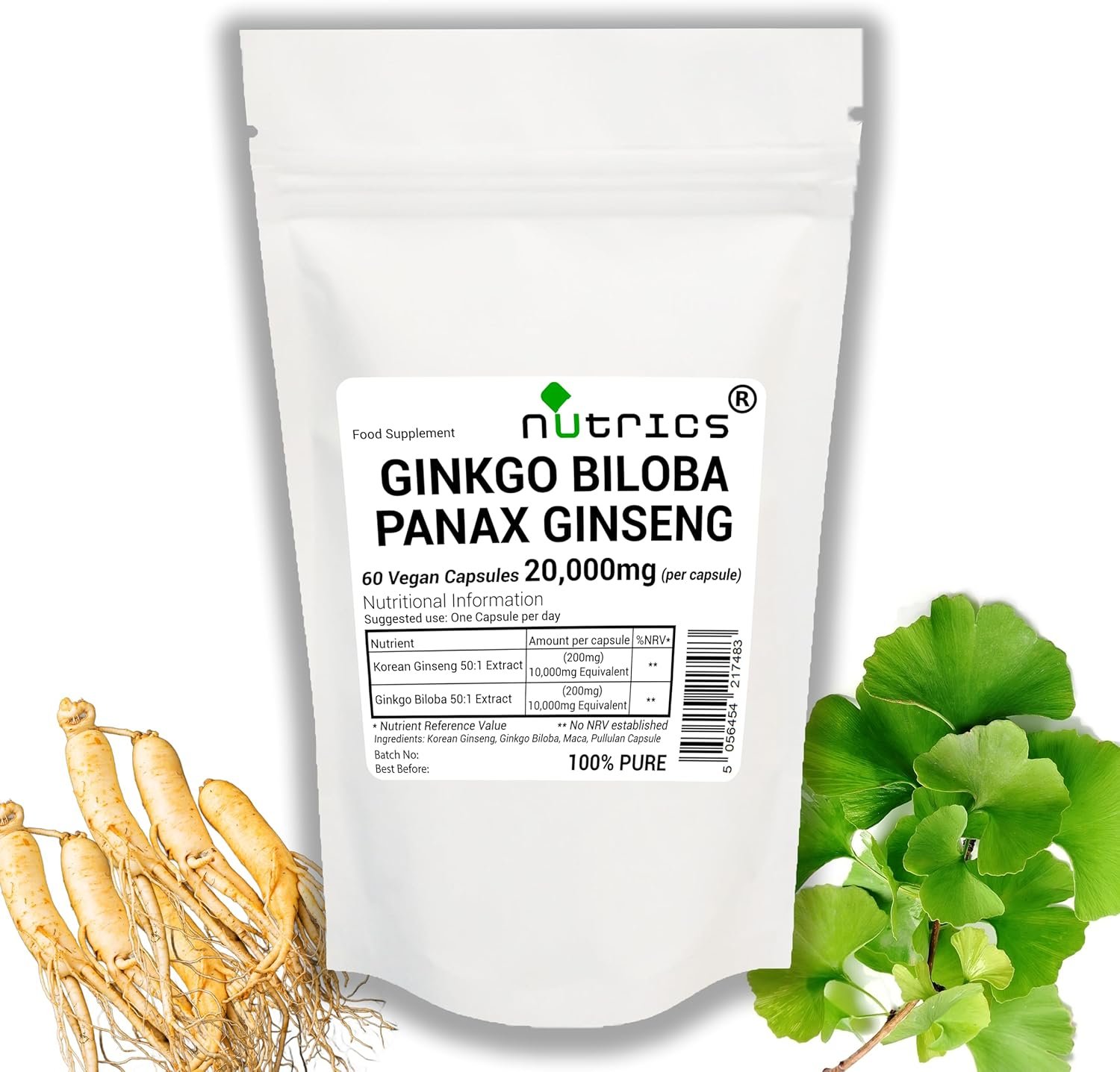 Nutrics 20,000mg GINKGO BILOBA & KOREAN GINSENG 60 V Capsules100% Pure Strong One A Day – Vegan Vegetarian – 60 Capsules (2 Months Supply))