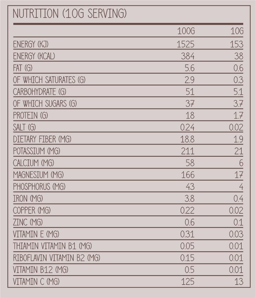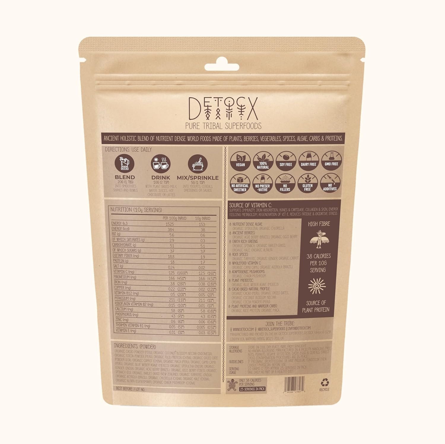 About us: Created with nutritionists to support Inflammation, Immunity, sleep, digestion, bones, metabolism, energy, oxidative stress, skin. High in fibre, Vit C, Protein. Ingredients include Cacao, Turmeric, Spirulina, Chaga Mushroom, Chlorella, Acai berry, Goji, Maca root, Barley grass, Ginger, Product free from Soy, Dairy, GMO, Sweeteners, Additives, Preservatives, Gluten. 100% Vegan, Natural, Organic, Plant based and recyclable packaging.