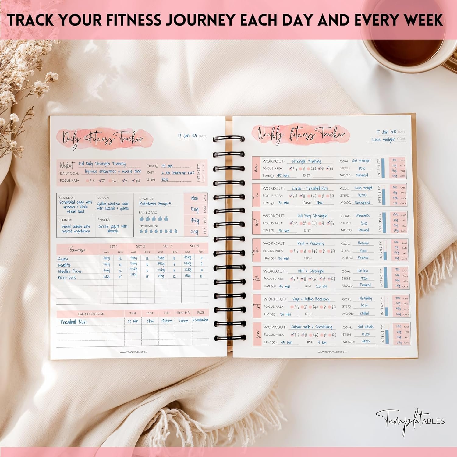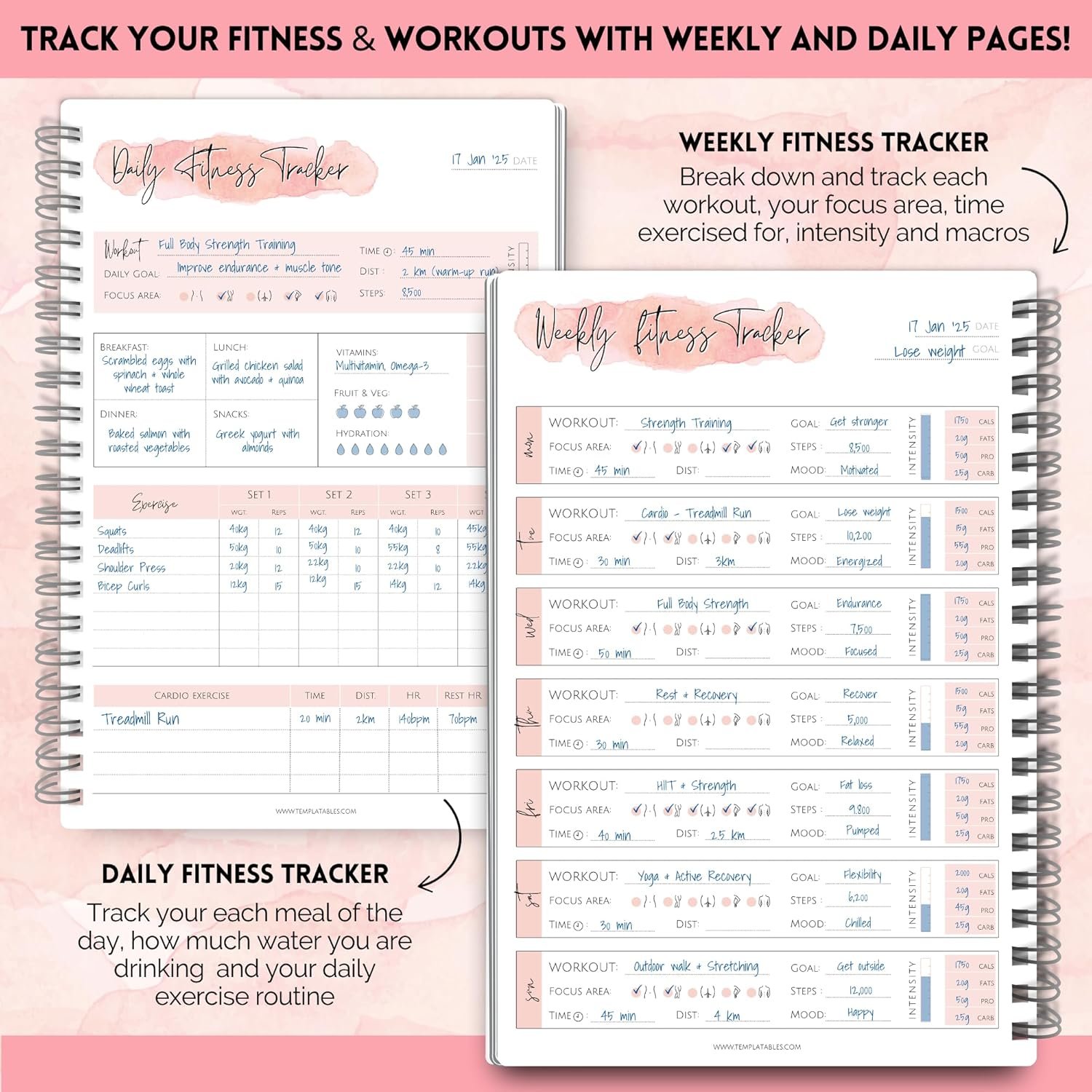 Daily, Weekly & Monthly Pages: Record meals, hydration, workouts, steps, supplements, and progress