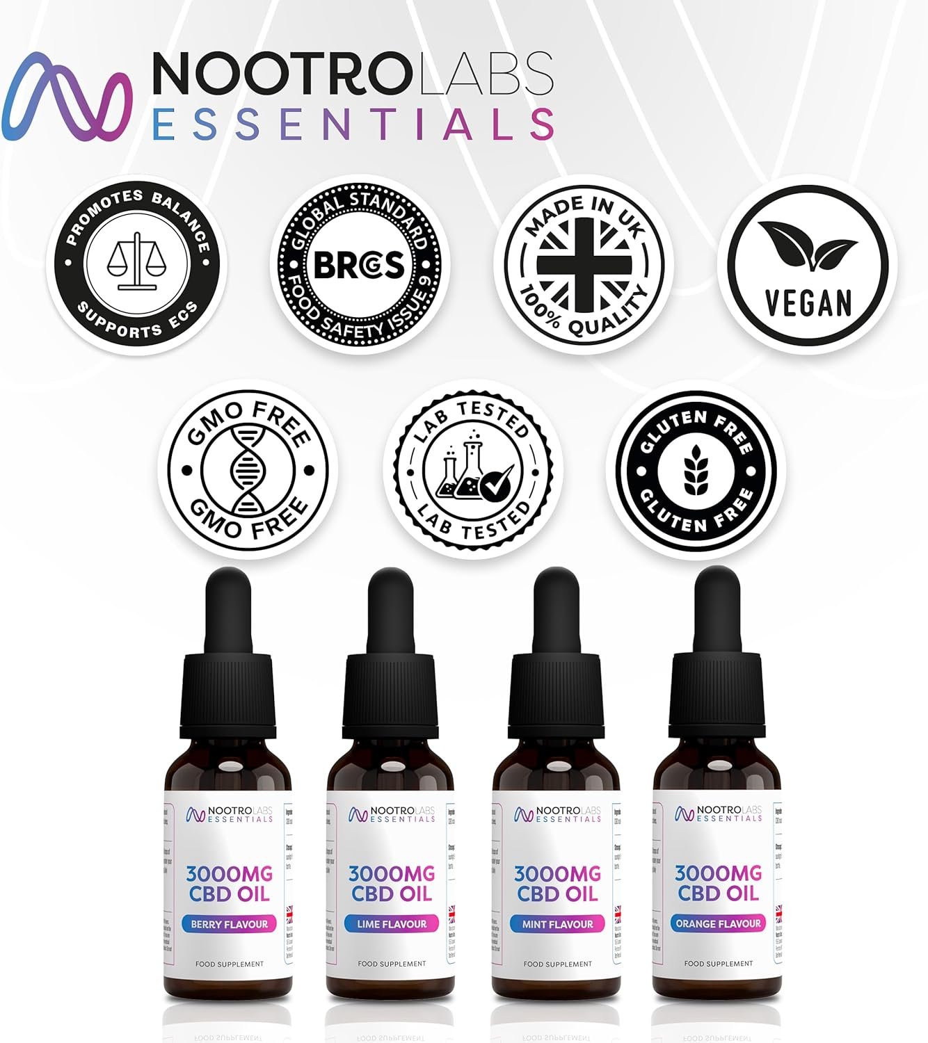 Nootro Labs 3000mg CBD Oil is a premium formula crafted for those seeking natural balance, calm, and recovery. This extra strong cbd oil is made with broad-spectrum cannabidiol (cbd), offering one of the strongest cbd oil for anxiety and wellness support on the market. Each 30ml bottle delivers cbd oil drops designed to provide consistent results, whether used for anxiety relief for adults, sleep aids for adults, or daily stress & anxiety relief. Infused with a refreshing berry flavour, these cbd drops make it easy to enjoy your wellness routine without the bitter aftertaste common in other cannabis oil or hemp oil products. With a clean formulation, coconut-based MCT oil, and 0% THC, this is a trusted choice for those looking for cannabidiol oil that is vegan, non-GMO, and designed to fit modern lifestyles. Many turn to cbd oil for pain or cannabis oil for pain relief high strength, and Nootro Labs offers exactly that, delivering high strength cbd pain relief alongside support for calm and relaxation. Recognised as one of the strongest cbd oil for pain and wellness options, this cbd high strength formula helps promote recovery, ease tension, and support better rest with cbd sleep benefits. Every batch is third-party lab tested for safety, consistency, and purity: free from pesticides, heavy metals, and unnecessary additives. Backed by science and created with care, this high strength cbd is more than just cannabis oil, it’s a reliable supplement for those who want the benefits of stress relief, anxiety relief, and better quality rest. Not suitable for anyone under the age of 18. Food supplements should not replace a varied diet or healthy lifestyle