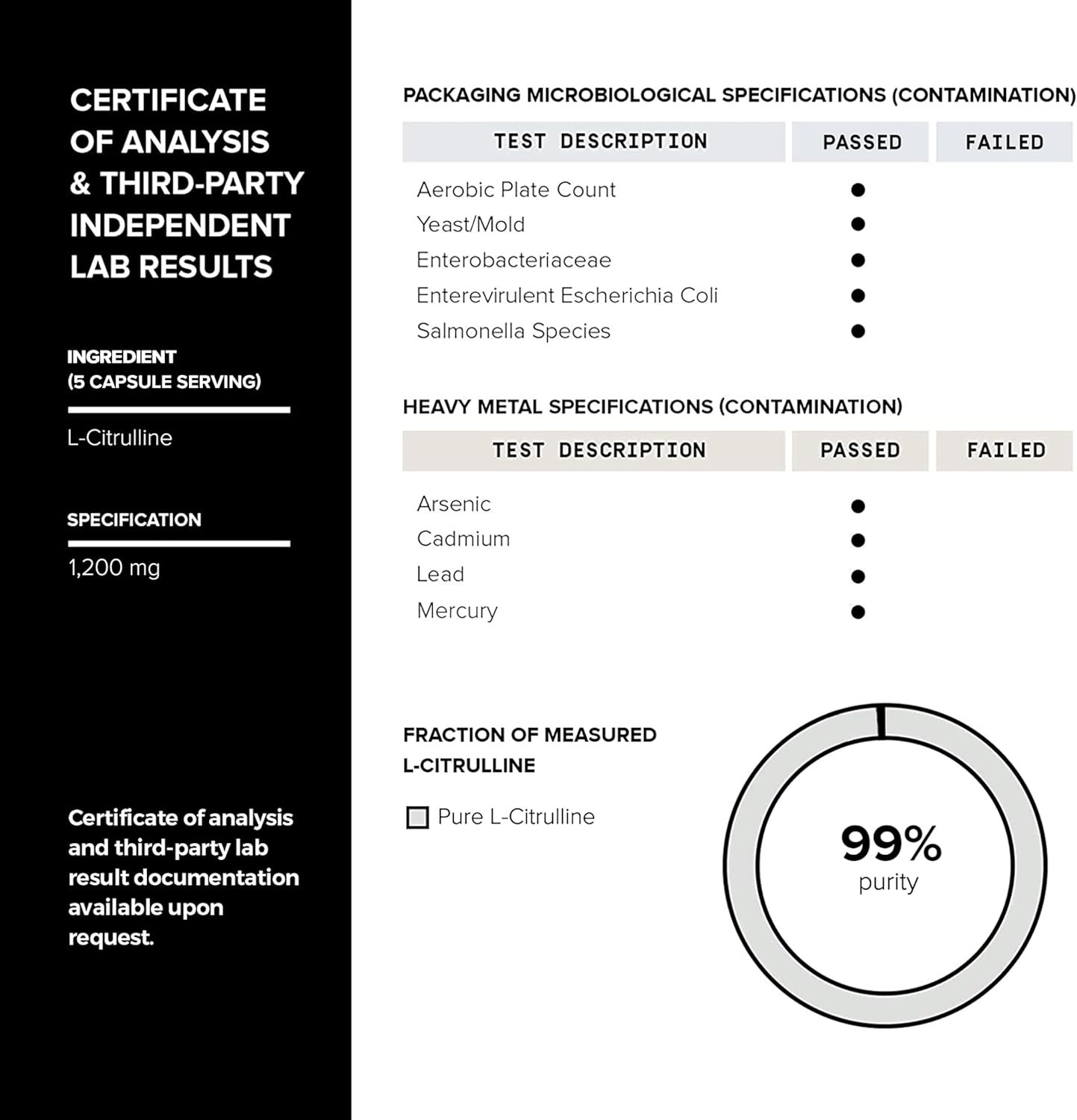 Setting a New Standard for Purity: To ensure that you are getting the highest-quality l arginine and l citrulline product (not to be confused with just Citrulline malate) , each batch is tested for quality and purity both during and after manufacturing.