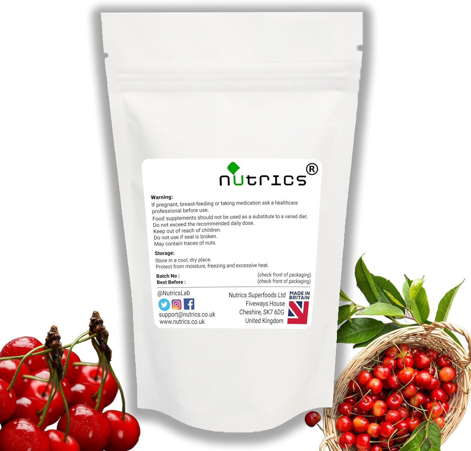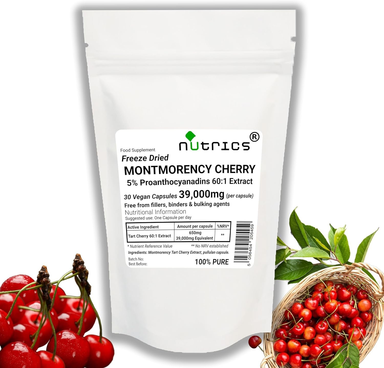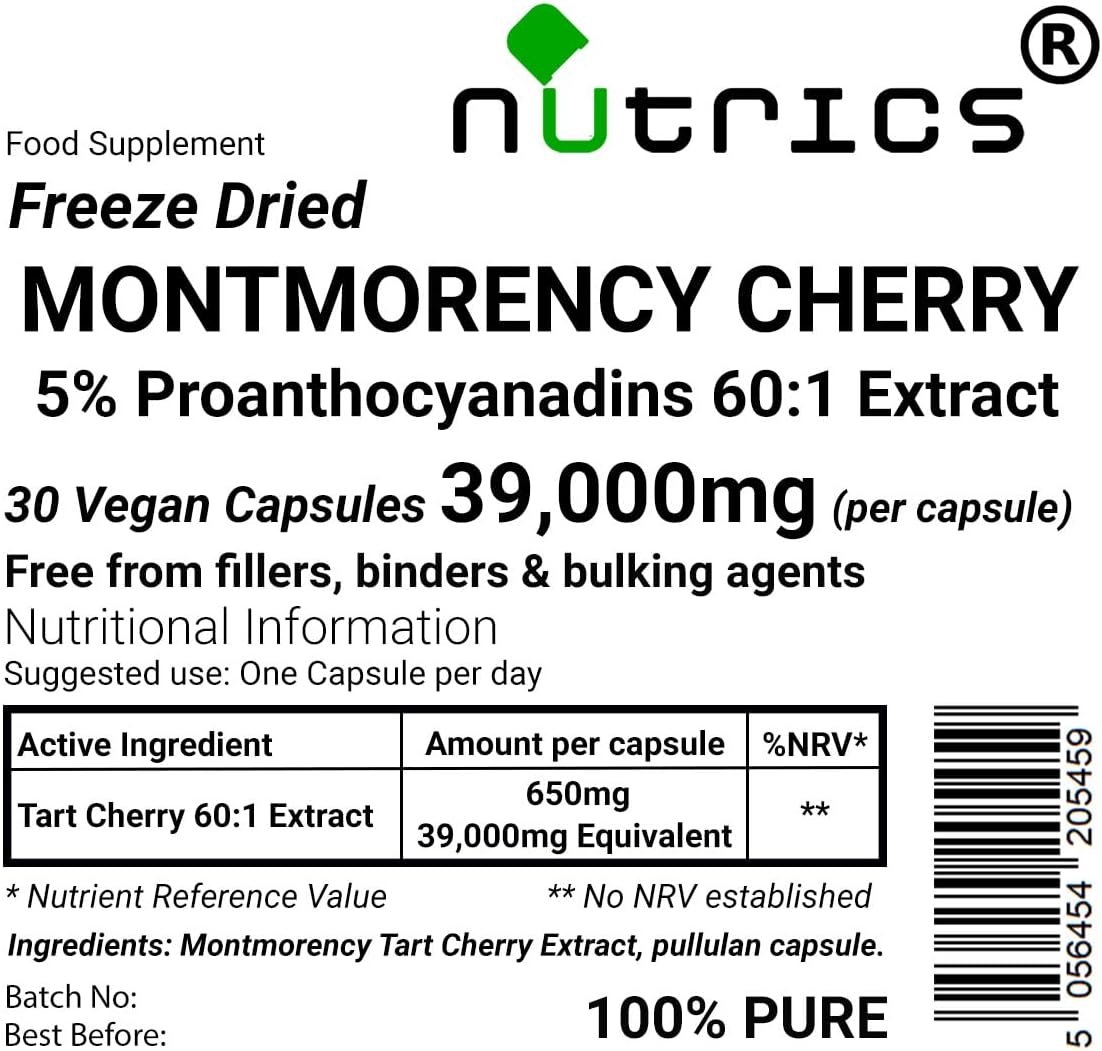 Nutrics 39,000mg (per capsule) 30 V Capsules MONTMORENCY TART CHERRY EXTRACT 60:1 Extract Ratio – 60 times stronger than tart cherry powder Standardised 5% Proanthocyanadins Pure, No fillers binders or bulking agents Suitable for Vegan, Vegetarian