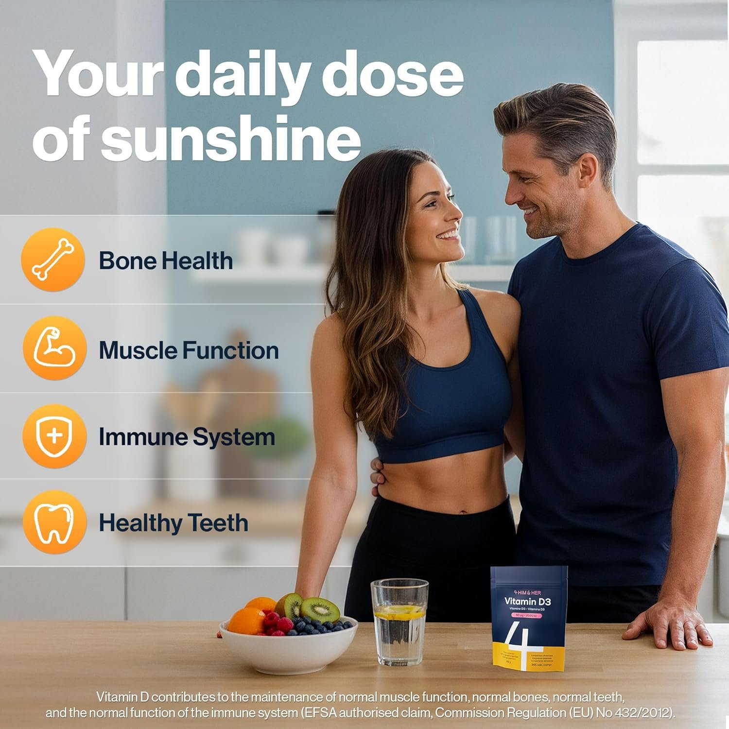 Key benefits of vitamin D: • Contributes to the normal function of the immune system • Helps maintain normal bones, muscles and teeth • Supports normal absorption and utilisation of calcium and phosphorus Trusted UK Manufacturing & Pure Ingredients: 4HIM & HER Vitamin D3 is manufactured in a GMP-certified facility in Britain. Tested for purity and potency, the strength stated on our pack is precisely what you receive in each tablet. It is also vegetarian, non-GMO, gluten-, soy-, nut-, and dairy-free. Long-lasting convenience A resealable, space-saving pouch contains 365 tablets—enough for a full year—so you avoid bulky plastic bottles and monthly re-orders. Directions & safety Adults: take one tablet daily with food. Do not exceed the stated dose. Food supplements should not replace a varied diet and healthy lifestyle. If you are pregnant, breastfeeding, taking medication or under medical supervision, seek advice before use. Keep out of reach of children.