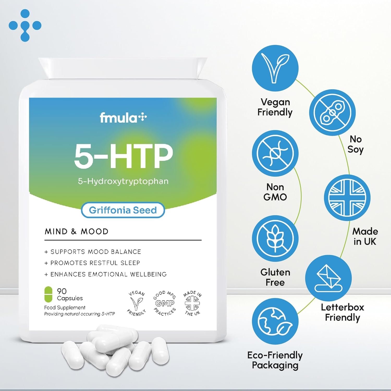 Manufactured in the UK to the GMP code of practice using quality ingredientsContains no gluten, dairy, nuts, fish or GMOs – formulated to complement most lifestylesProvides amino acid 5-hydroxytryptophan, a precursor to serotonin for mood supportIdeal for unwinding before bed or early in the morning to elevate your moodFormulated to help aid sleep without any unnecessary additives or chemicalsHelps maintain normal energy levels and focus throughout your day-to-day