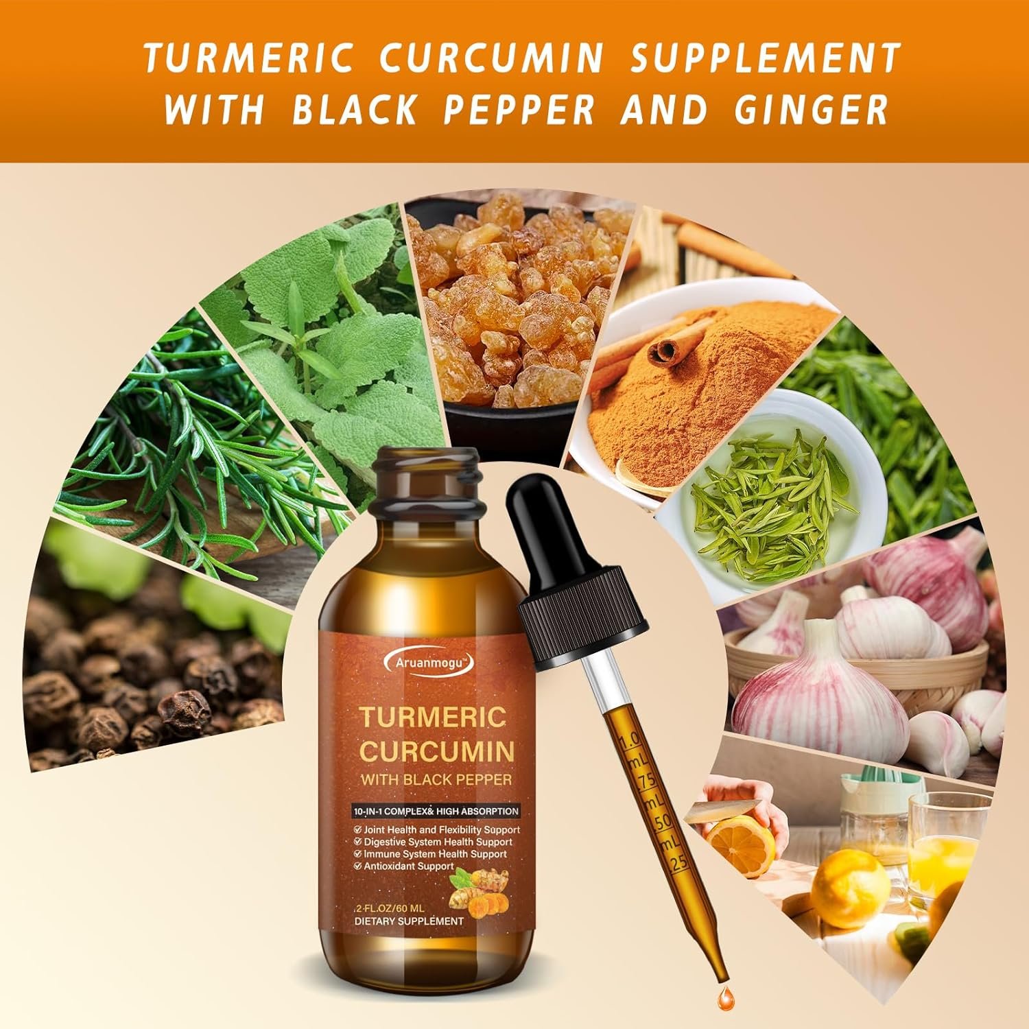 60ML Turmeric Curcumin Supplement for Adults, with Black Pepper and Ginger – Liquid Turmeric Extract Drops – Joint & Immune Support,Flexibility and Digestive Health