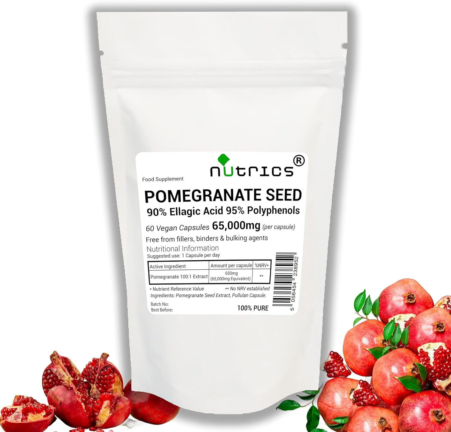 Nutrics Pomegranate Seed Extract 65,000mg per capsule 100:1 Extract = 100 times stronger than powder 650mg of pure extract equivalent to a massive 65,000mg/65g of seed standardised to 95% polyphenols 90% Ellagic Acid Strong One A Day Formula
