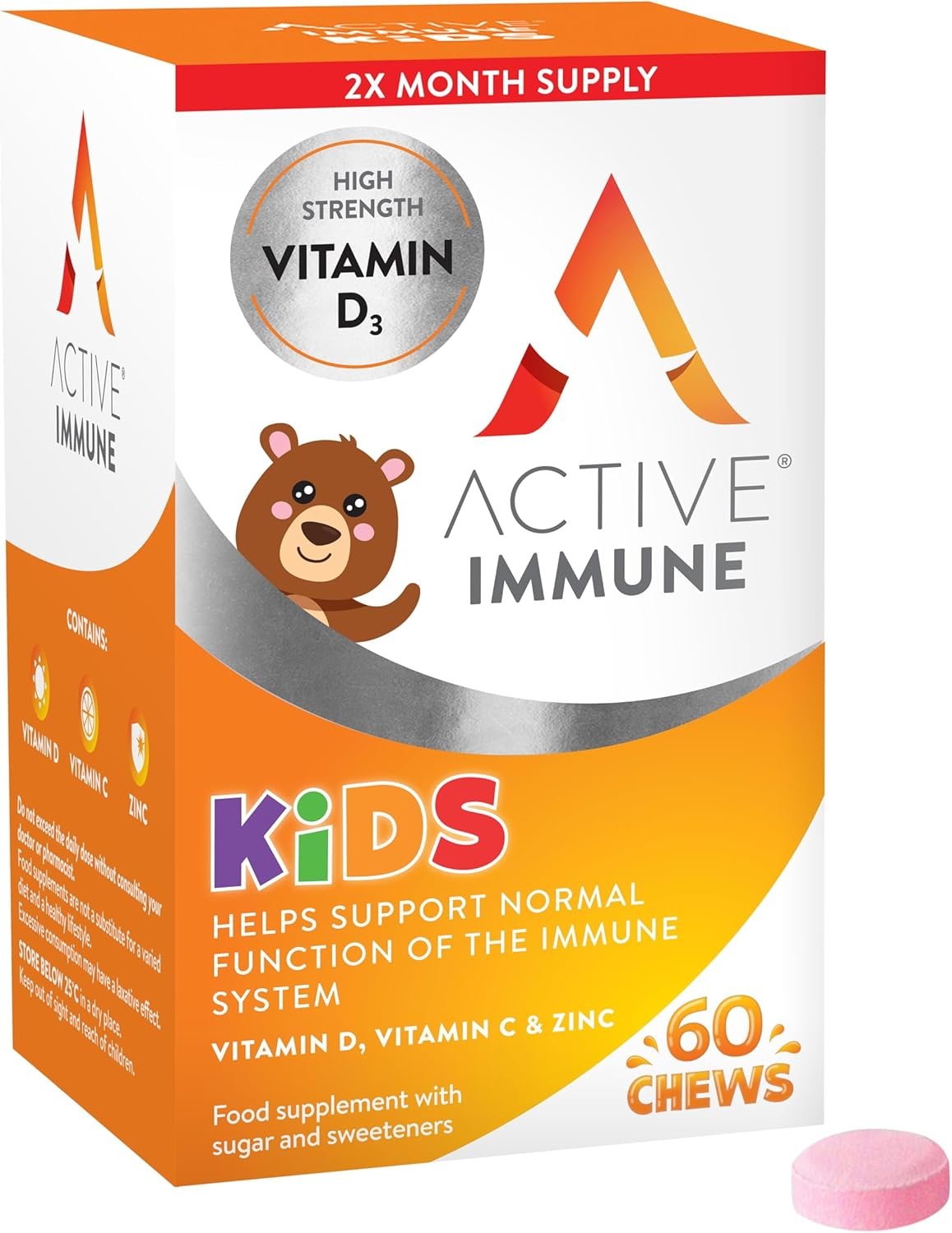 Active Immune Kids Supplement, Vitamin D, C & Zinc, Daily Multivitamin for Kids Immune System, Chewable & Easy to Swallow, 60 Orange Flavoured Chews, 2 Month Supply