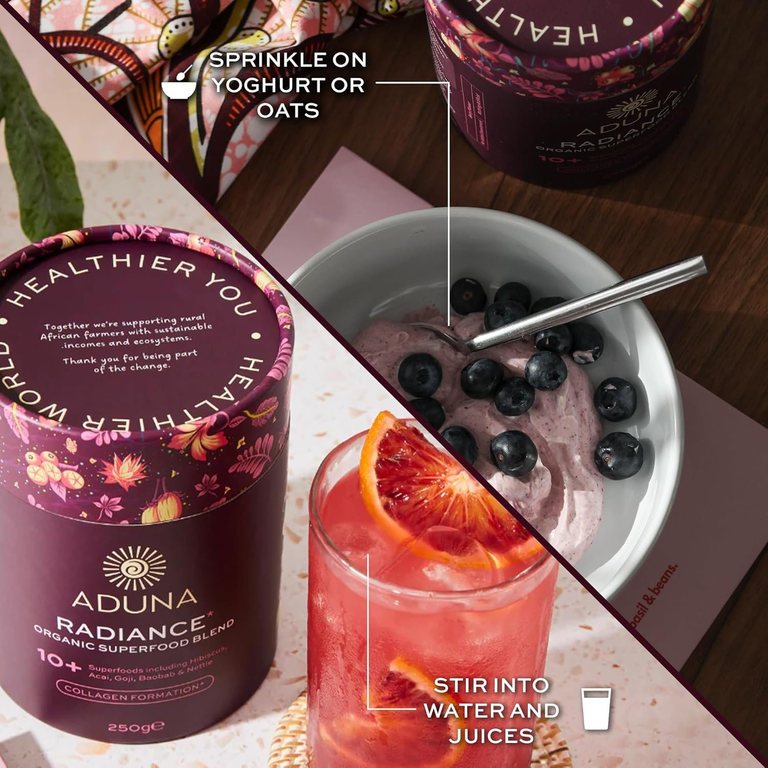 GLOW FROM THE INSIDE OUT: Aduna Radiance Superfood Blend is a deliciously tangy mix of 14 skin-loving superfoods including hibiscus, baobab and lion’s mane. Nutritionist-approved and rich in natural antioxidants, it supports skin health, hormone balance and everyday glow with every spoonful.