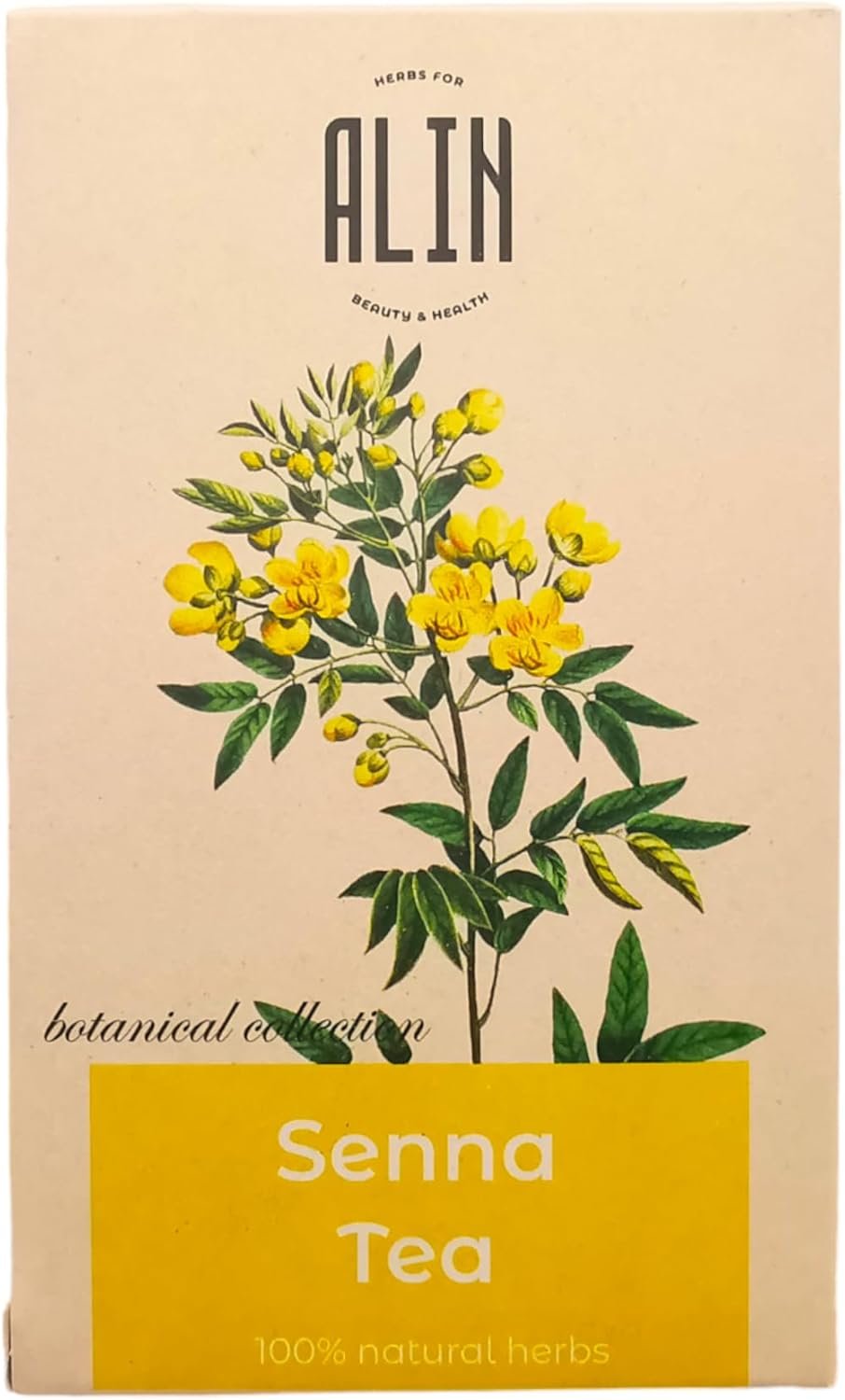 ALIN Natural senna leaves tea Net quantity: 30 grams per box, Country of origin: Bulgaria Method of preparation: Put 1 tea bag in 250 militers of pre-boiled water and let steep for 7-8 minutes. Best taken before bedtime. Sweetened as desired. Contains no genetically modified compounds, preservatives and dyes. A pack contains 20 tea bags, each 1.5 gram tea bags Instructions for use: Senna leaf tea should not be taken for more than 2 weeks. It is recommended to take 2 to 3 times a week in the evening. The herb should not be taken in the case of unknown abdominal pain without a medical diagnosis, severe dehydration symptoms, intestinal obstruction (intestinal obstruction), appendicitis and inflammatory bowel diseases (e.g. Crohn’s disease, ulcerative colitis etc.). Manufacturer, NVN Bilki za Krasota i Zdrave”, Bulgaria, Lot and expiry date: see box.