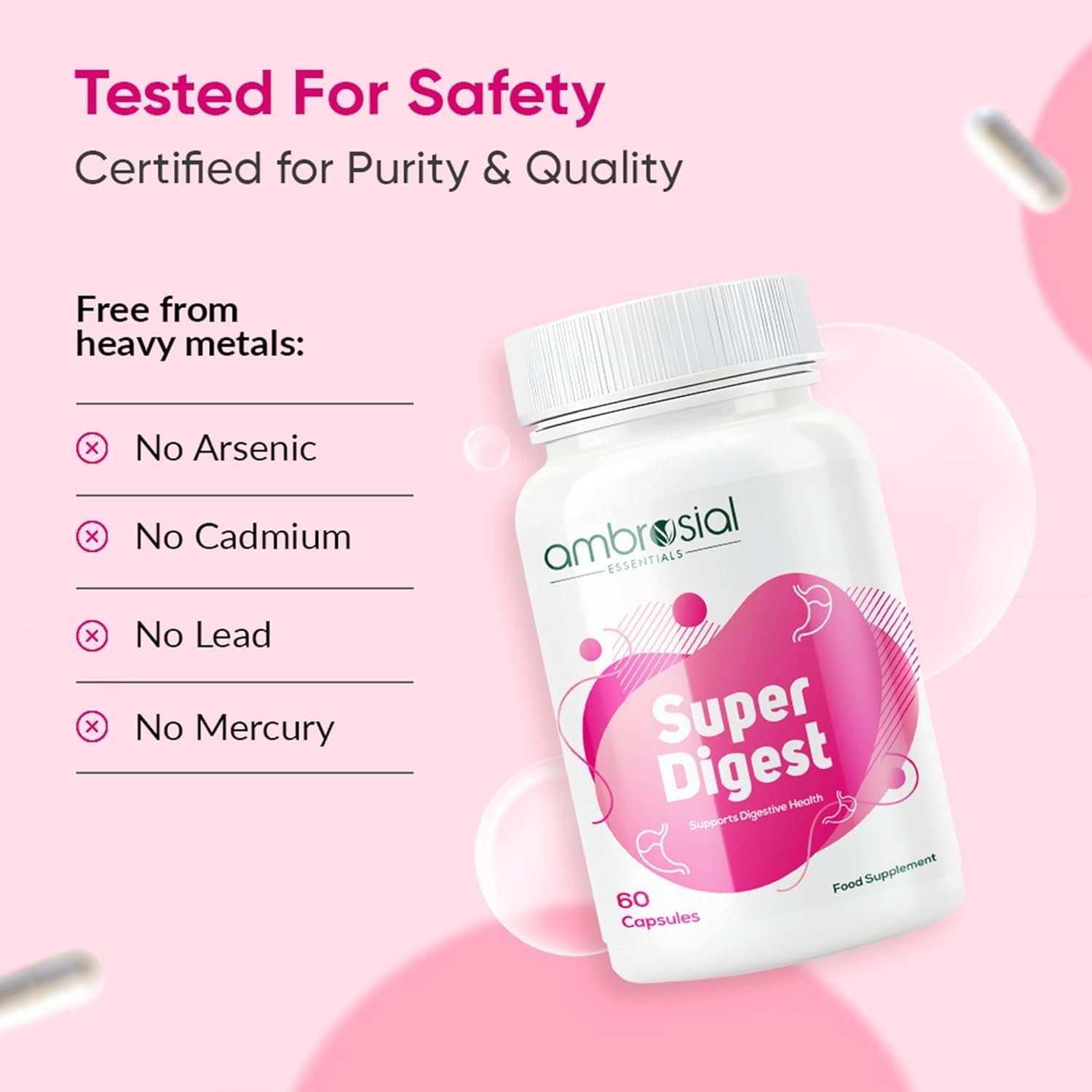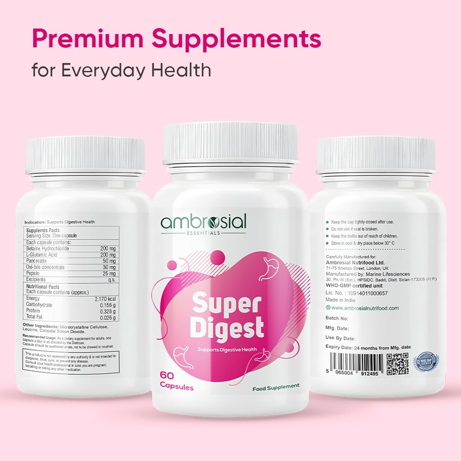 Ambrosial Super Digest – Advanced Digestive Enzyme Supplement with Betaine HCl, Pepsin, Ox Bile & L-Glutamic Acid – Gut Health & Nutrient Absorption Support – GMP-Certified, 60 Capsules (2 Months)