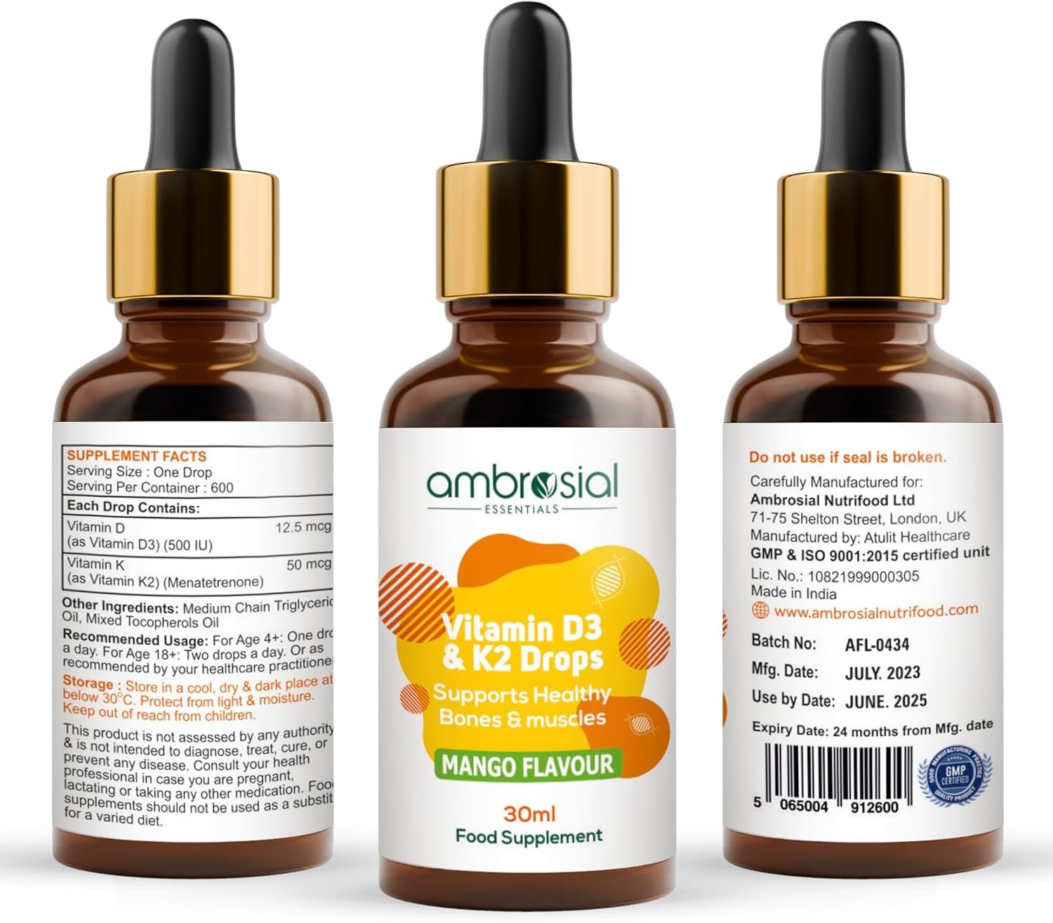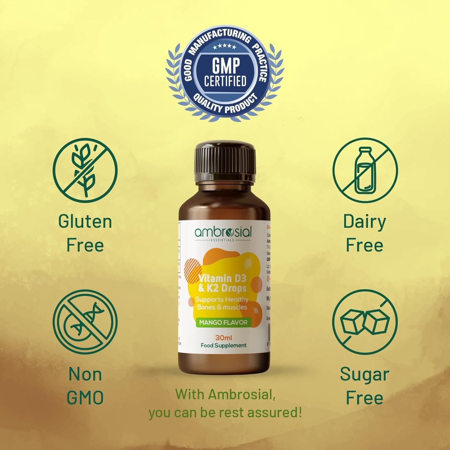 Ambrosial Vitamin D3 K2 Drops – Liquid Supplement for Adults & Kids, Mango Flavor, High Strength, 500 IU Vitamin D3, 50 mcg Vitamin K2, Gluten Free, Vitamin D Drops, for Immune System Vitamins- 30 ml