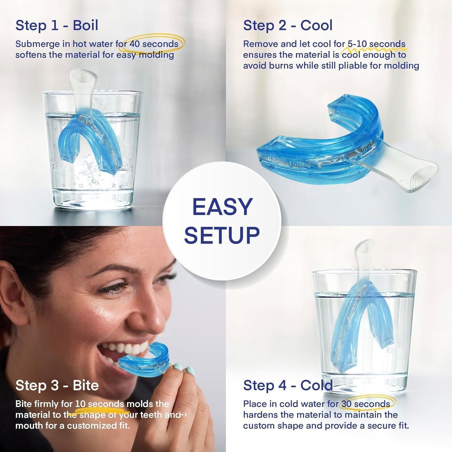 Dentist-Designed Comfort – Made with medical-grade, BPA-free silicone, this [anti-snoring device] fits securely without boiling. The [snoring mouthpiece] is hypoallergenic, odor-free, and molds naturally for all-night comfort.