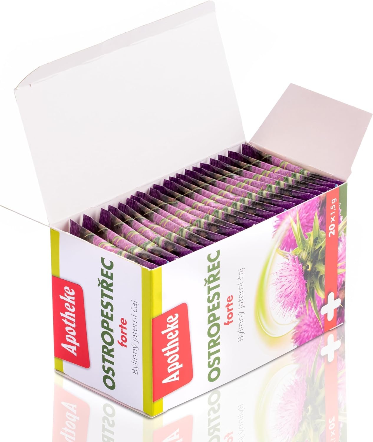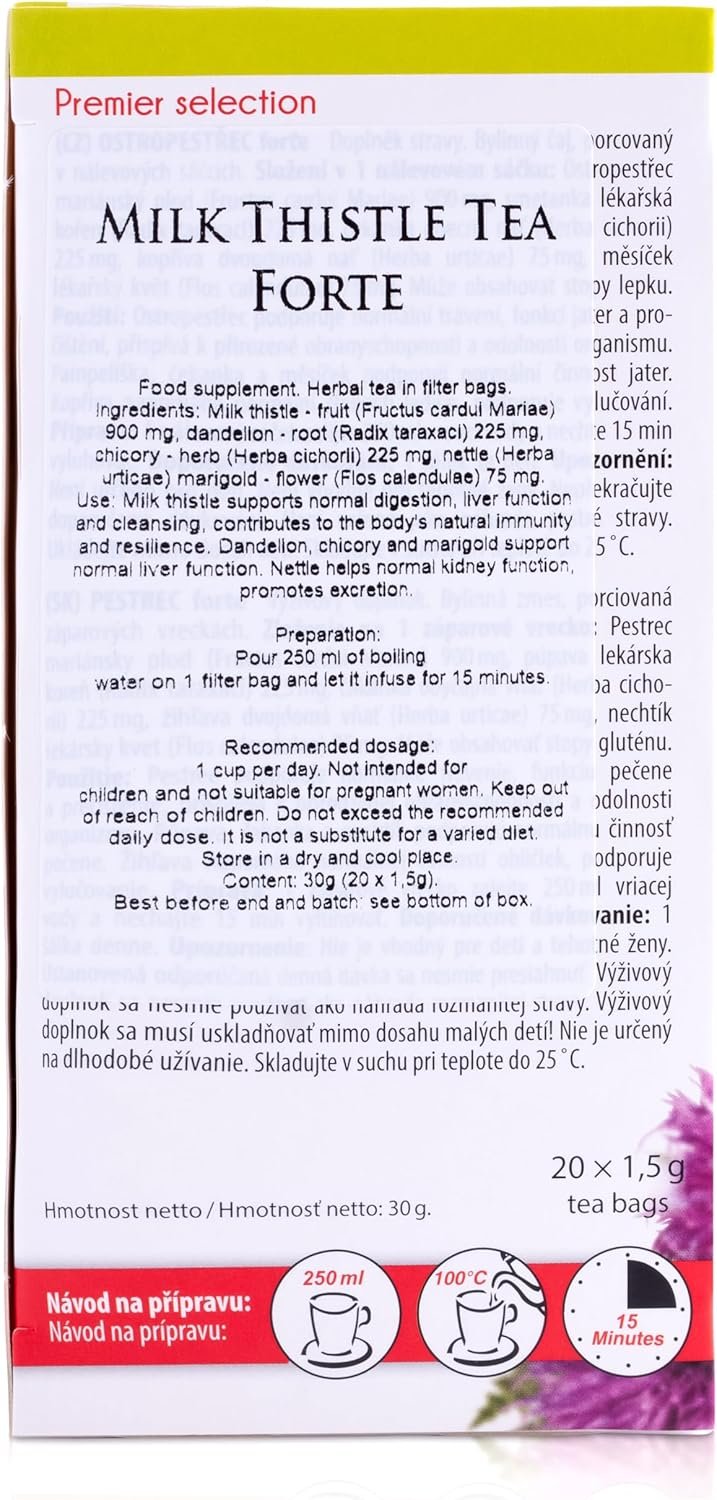 Herbal tea, portioned in infusion bags. Ingredients (in 1 infusion bag): Milk thistle – fruit (Fructus cardui Mariae) 900 mg, milk thistle – root (Radix taraxaci) 225 mg, chicory – root (Herba cichorii) 225 mg, nettle – root (Herba urticae) 75 mg, calendula – flower (Flos calendulae) 75 mg.
