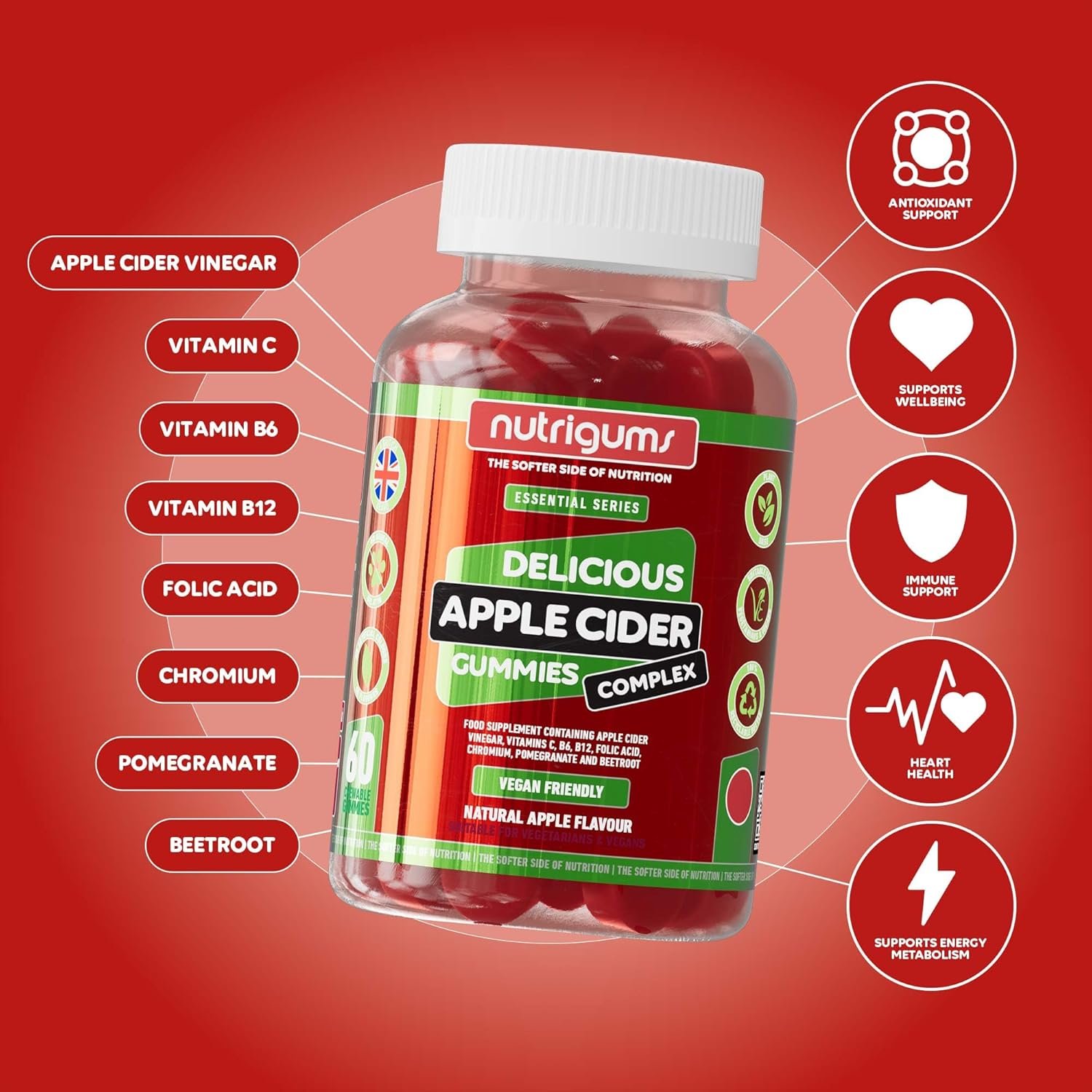 Apple Cider Vinegar Complex with Mother 1000mg Gummy | Vitamins C, B6, B12, Folic Acid and Chromium | Apple Flavour | 60 Vegan Gummies | Digestive Health, Energy and Metabolism Support by NUTRIGUMS®