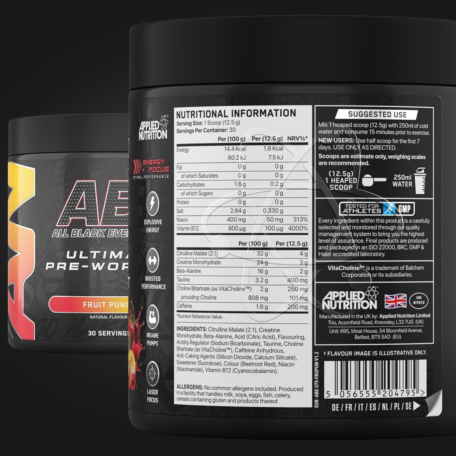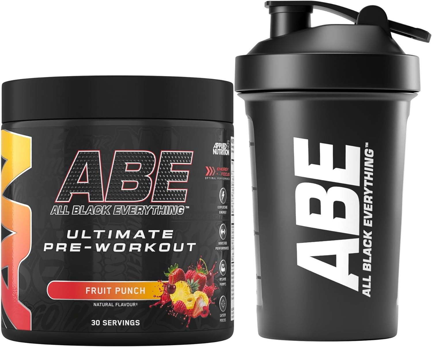 Applied Nutrition Bundle ABE Pre Workout 375g + ABE Black Shaker 400ml | All Black Everything Pre Workout Powder, Energy Drink, Physical Performance, Creatine, Beta Alanine, Caffeine (Fruit Punch)