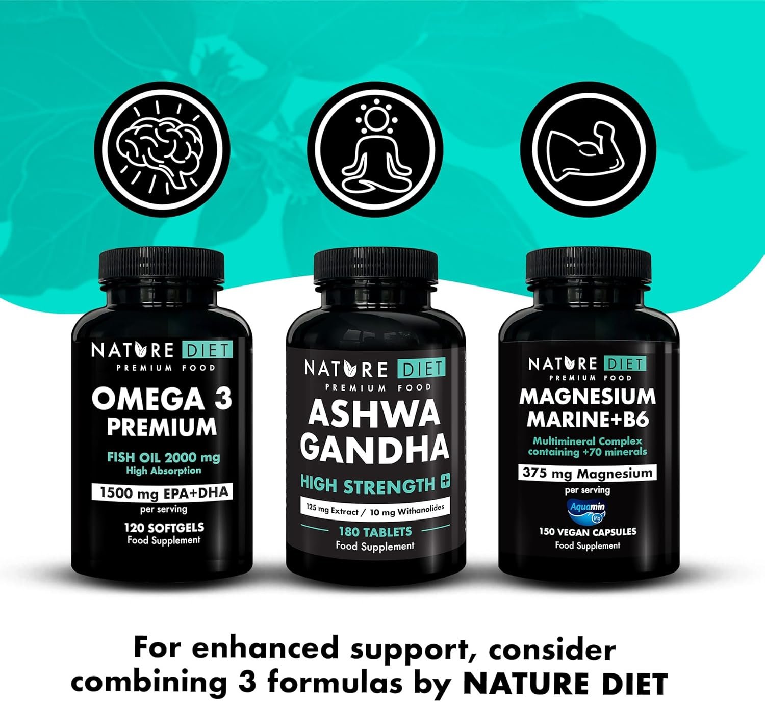 Ashwagandha High Strength Plus | 125 mg Root Extract with 10 mg Withanolides | 180 Vegan Tablets | 6-Month Supply | Supports Stress & Anxiety Relief, Better Sleep, and Energy Balance | by Nature Diet