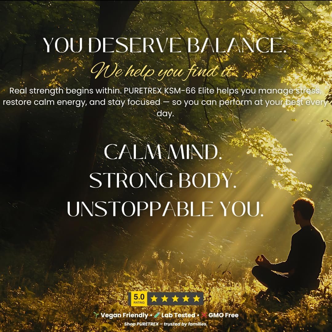 PURETREX Ashwagandha KSM-66 Elite Formula is a premium adaptogen complex designed to support balance, focus, and resilience. Made with the gold-standard KSM-66 Ashwagandha root extract, each serving is equivalent to 7200 mg of raw root powder. Our advanced hybrid adaptogen blend combines natural ingredients known for promoting calm energy, mood balance, and overall performance. Formulated in the UK with high quality standards, this supplement comes in easy-to-swallow vegan capsules, suitable for both men and women seeking a natural way to support everyday wellbeing.