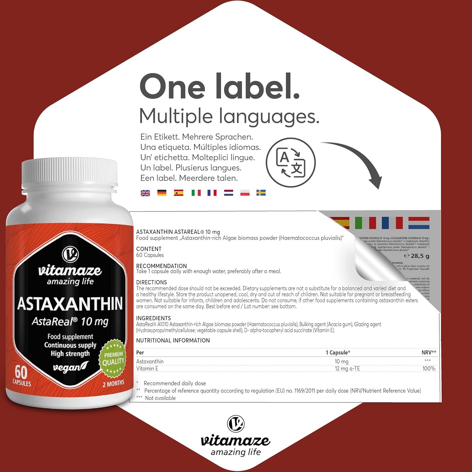 Our astaxanthin capsules contain 10 mg of high-dose natural astaxanthin, which is produced from the blood algae Haematococcus pluvialis and spirulina algae (blue-green algae). The astaxanthin is supplemented with vitamin E. Vitamaze Astaxanthin consists exclusively of non-animal ingredients and is therefore ideally suited for VEGETARIANS and VEGANS. Our product is completely free from genetically modified ingredients and unnecessary additives and contains no magnesium stearate (magnesium salts of fatty acids), a controversial additive, for OPTIMAL ACTIVITY. Many other manufacturers use magnesium stearate in their production, but we produce in Germany. Our production complies with the HACCP concept. We work closely with scientists and experts in the development and manufacture of our products.