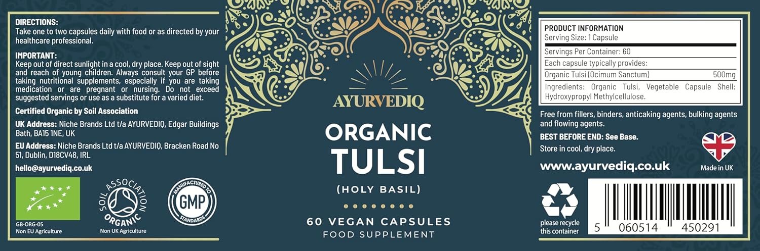 Ayurvediq Organic Tulsi Capsules x60 500mg (Ocimum Sanctum) – Tulsi/Organic Holy Basil Capsules – 100% Soil Association Organic Stress, Immunity Health and Wellbeing Supplements