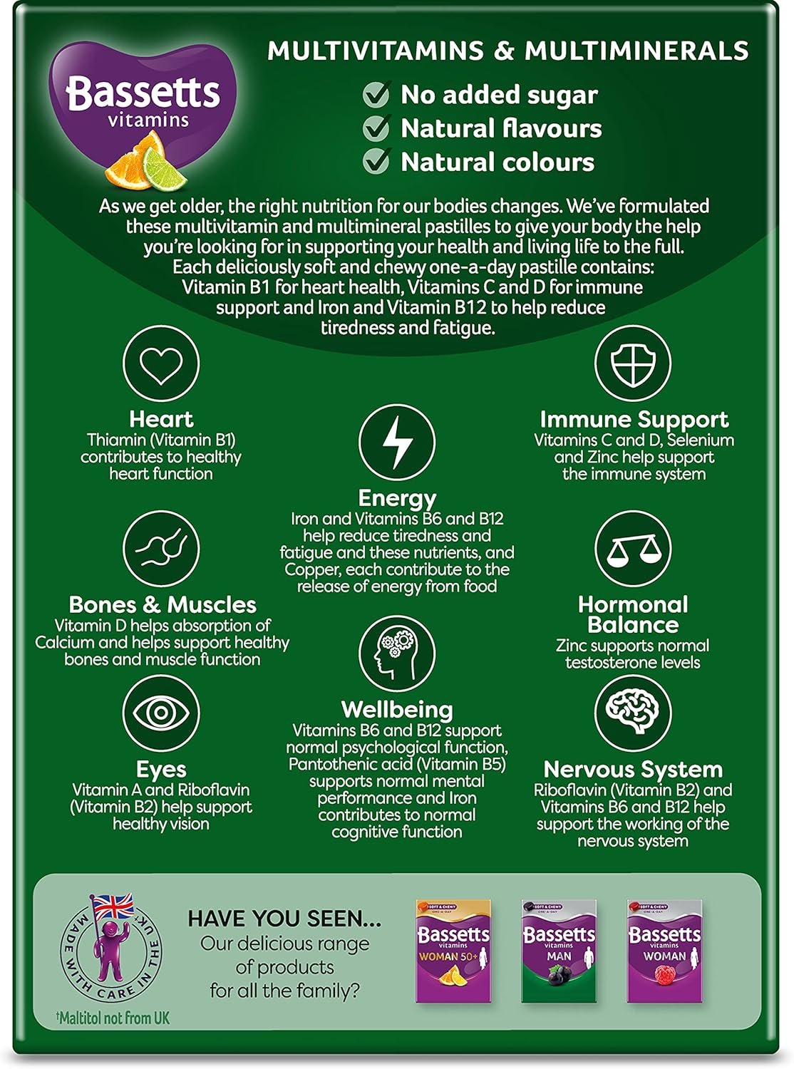 As we get older, the right nutrition for our bodies changes. We’ve formulated these multivitamin and multimineral pastilles to give your body the help you’re looking for in supporting your health and living life to the full. Each deliciously soft and chewy one-a-day pastille contains: Vitamin B1 for heart health, Vitamins C and D for immune support and Iron and Vitamin B12 to help reduce tiredness and fatigue.