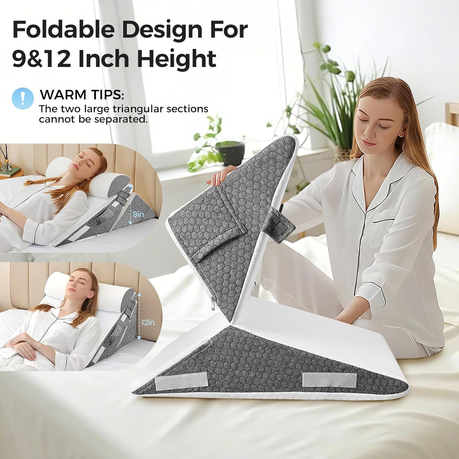 【10-in-1 Adjustable Wedge Triangle Pillow】Our bed wedge pillow set for sleep apnea has 2 adjustable height (9 inch or 12 inch), offers a dynamic 10-in-1 adjustable design to support your body in all positions. Effortlessly meets your different needs like reading, working, or relaxing.