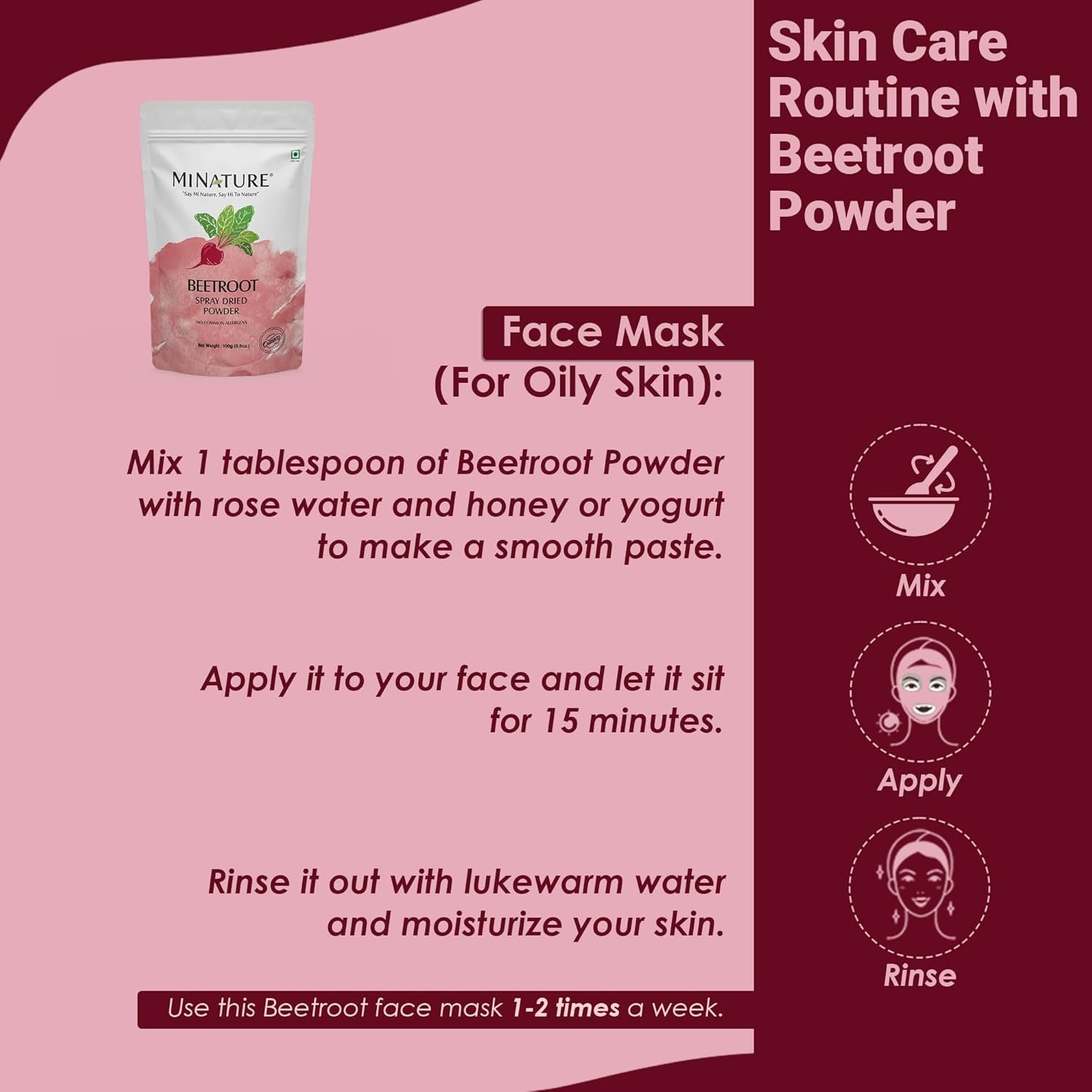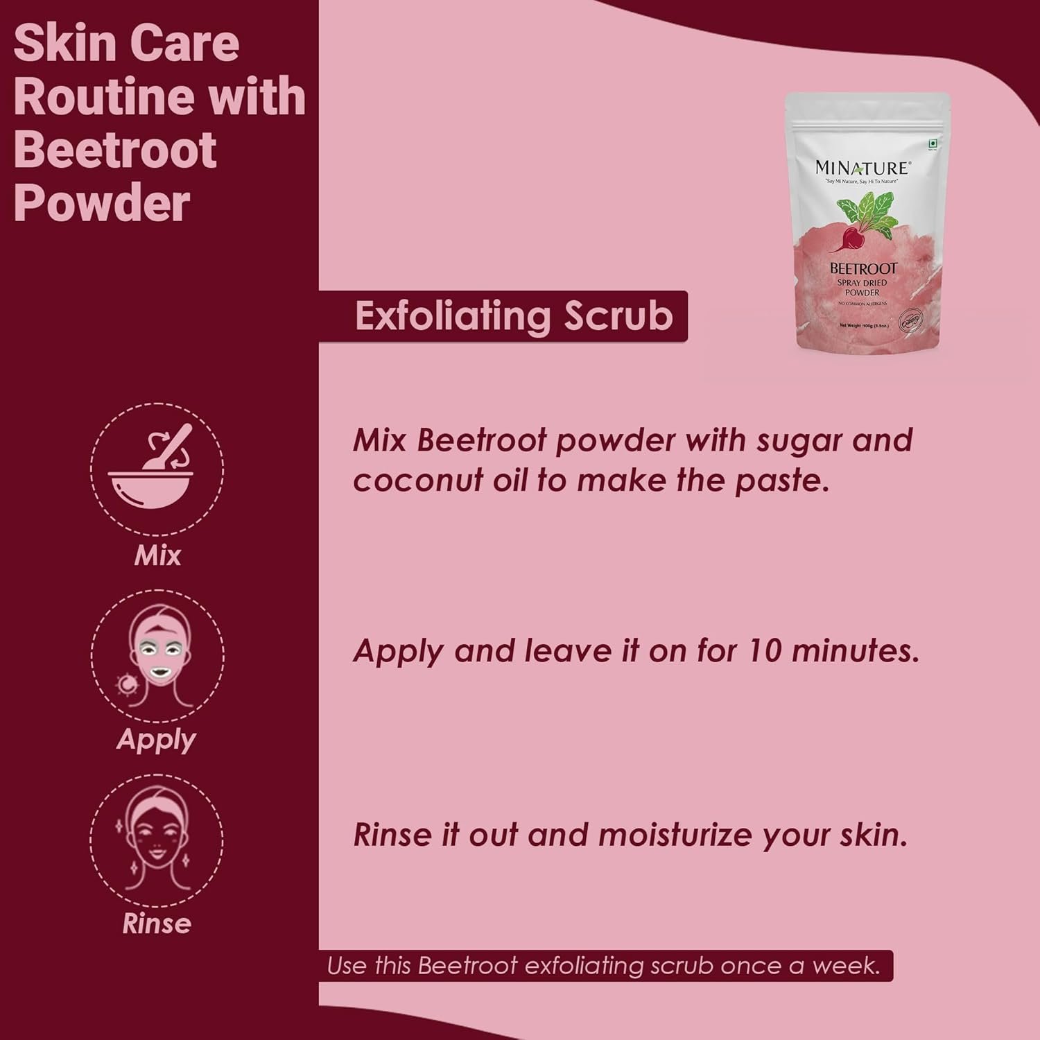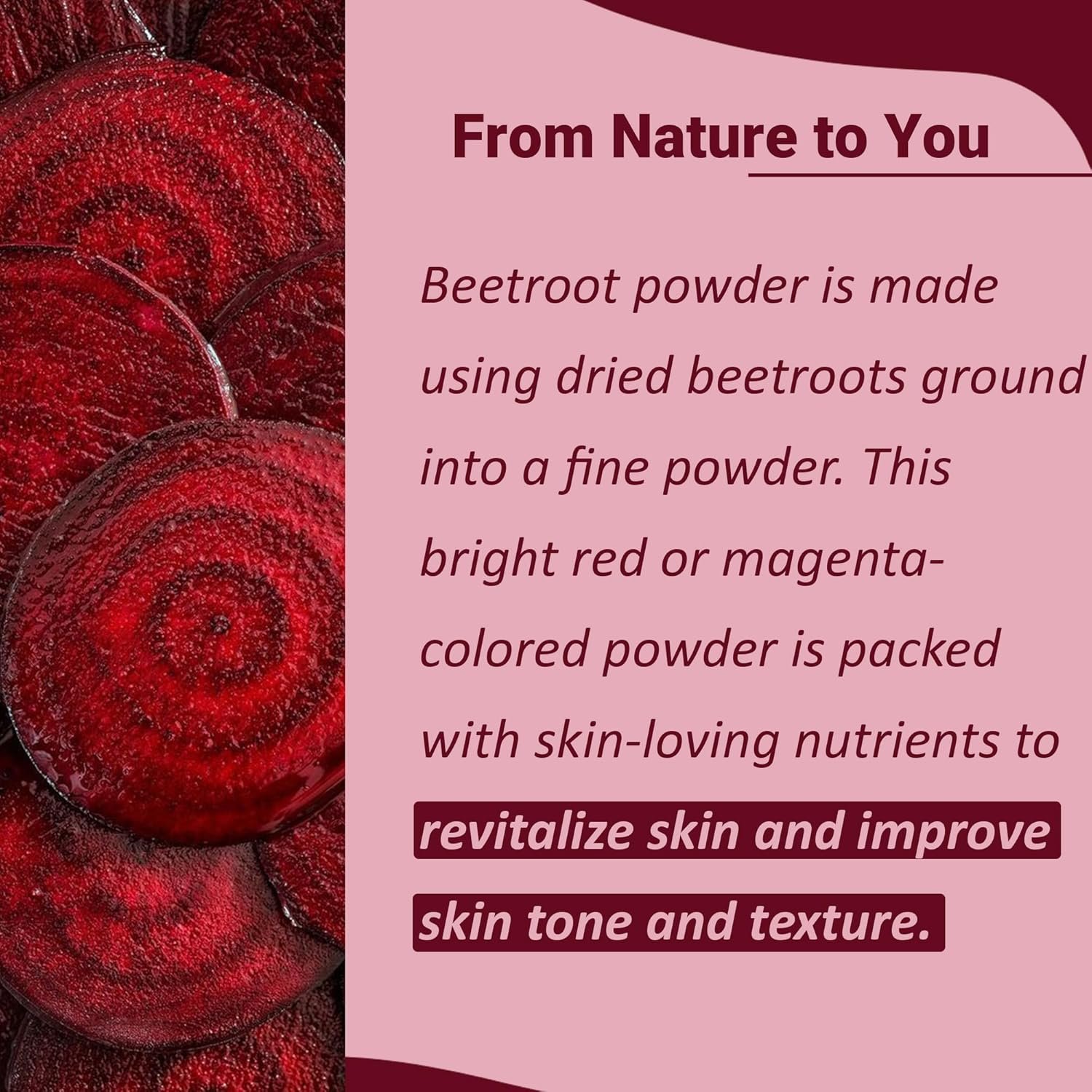 Pure Beetroot Powder for Skin: It can be applied as a face pack for glowing, shiny skin. his powder is commonly used in DIY lip balms or scrubs, and can also be used in hair masks for conditioning and adds shine.