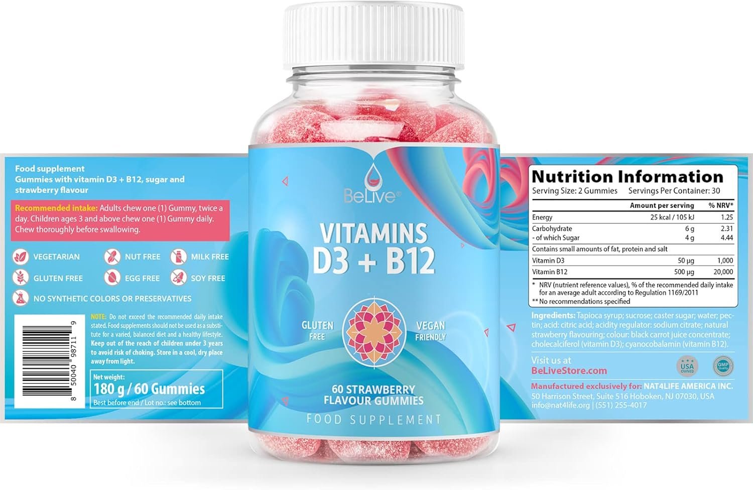 BeLive Vitamin D3 Gummies with B12 Vitamins – 60 Ct I Vegan Immune Support Gummies with Vitamin B12 & D3, Provides Enhanced Bone & Muscle Strength, Hearth Health and Energy – Strawberry Flavour